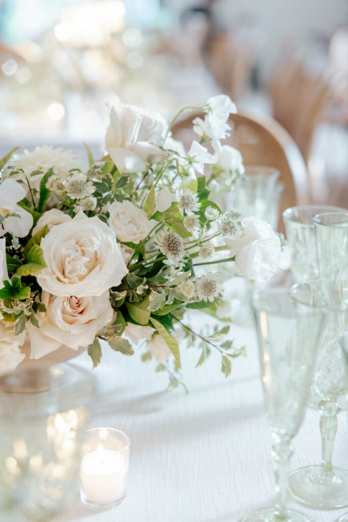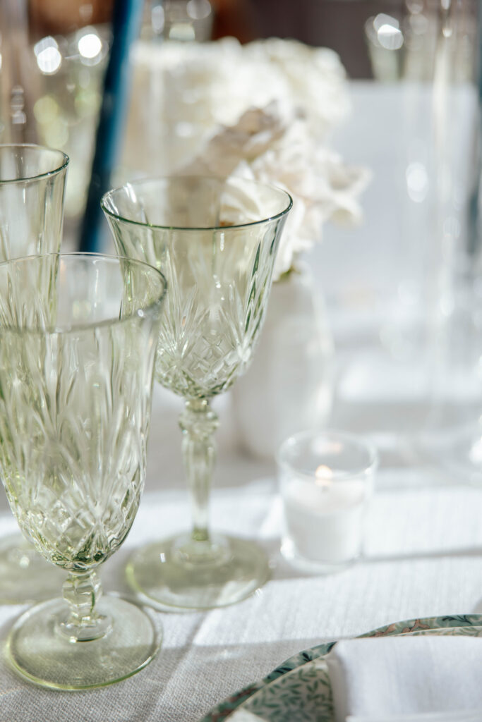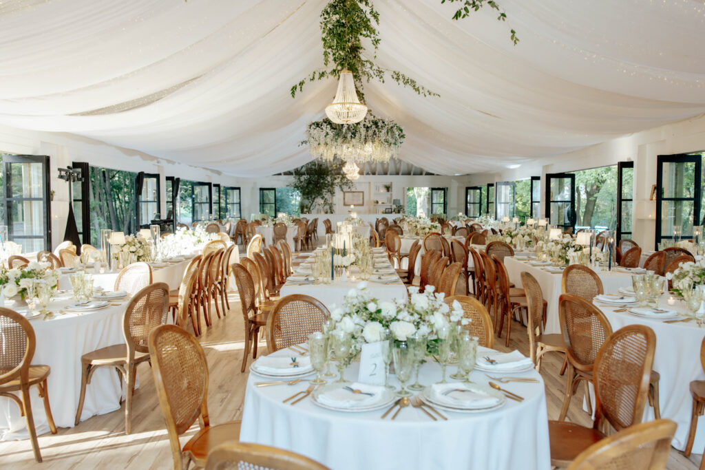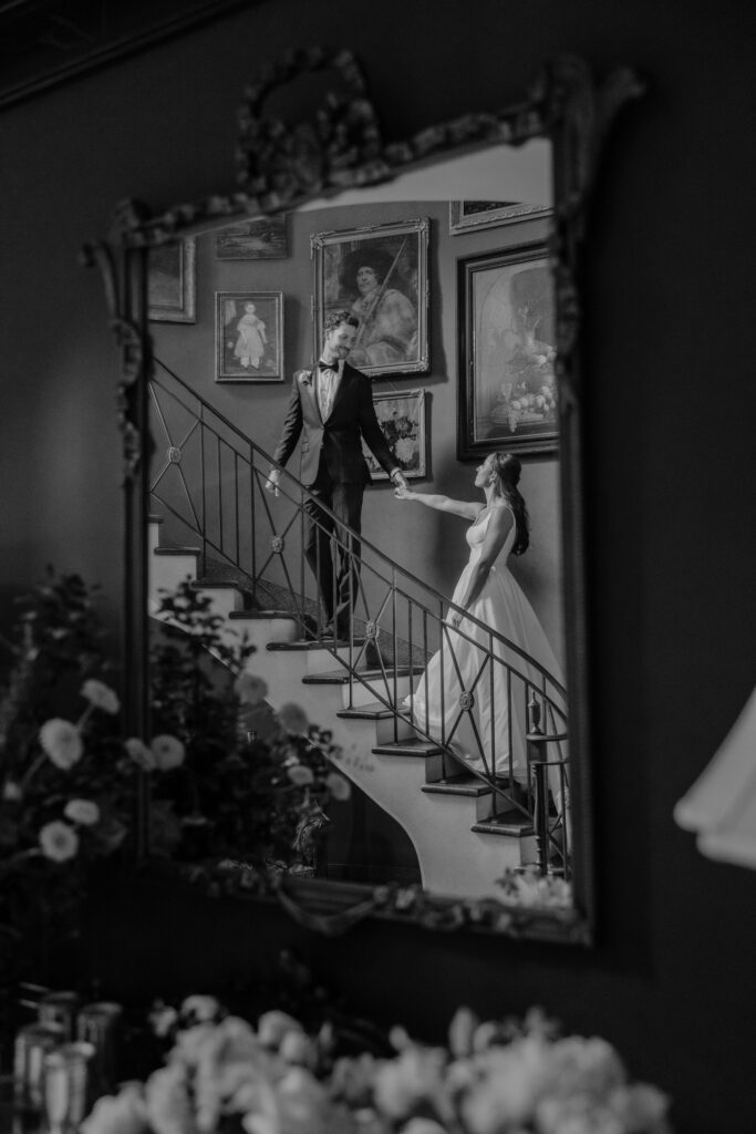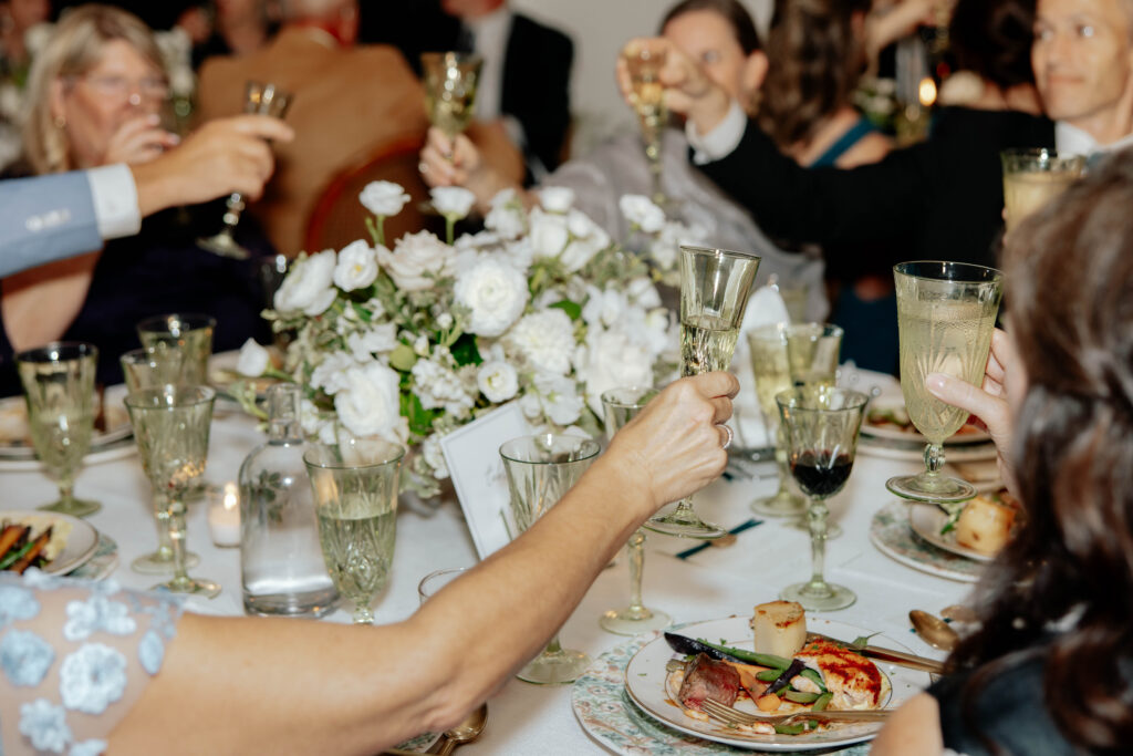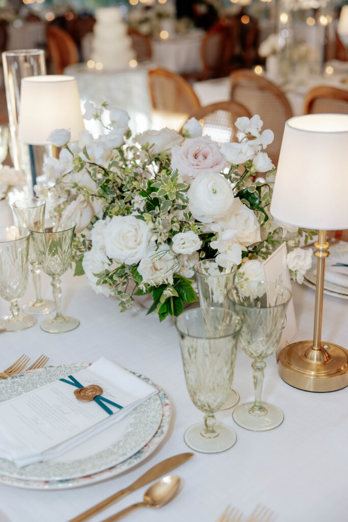 Cocktail hour was enjoyed throughout the grounds and in the East Veranda, signature cocktails were beautifully made and guests mingled in their best garden party attire. The reception space was set and it was jaw-droppingly gorgeous. The dinnerware chosen for the reception was a beautiful, considered mix of patterns, florals, and earthy tones that felt both elegant and deeply personal. Walking into that reception space felt like walking into something that had been dreamed up with real intention. Because it had. One of the most tender details of the reception was easy to miss if you weren’t looking: the walls held framed portraits of family couples on their own wedding days. Generations of love, hung in the room where Lance and Caroline were beginning theirs.