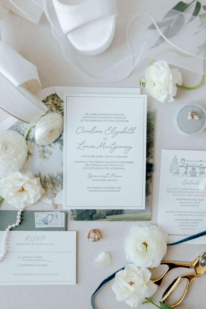 I tucked myself away in the quiet of the bridal suite of Greencrest Manor where I was able to photograph details. Greencrest had all the details and paper suite extras set aside with floral snips which add so much to a flat lay. Jenn, the owner of Greencrest Manor, is one of those rare people who pours herself into her work in ways that go far beyond what anyone would expect. She is a hospitality expert and a pillar in this wedding industry to take notes from. In every aspect, she has created an environment of vendor support and encouragement.